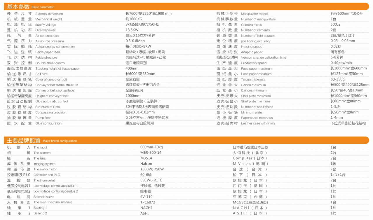 本機采用日本三菱 600 行程機械手,進口攝像頭,松下 pLc 等國際高端電器,定位尺寸大,精度高,運行穩定.速度快,可操控性強,轉版調機五分鐘左右,適合各種紙盒、皮殼、內神狗送紙、過膠、對位生產,尤其是下拉式貼內襯裝置完全解決了皮殼刮花的問題。該機全部由本公司自主研發、設計、生產,其中伺服凸輪飛達部分、過膠部分、榴字控制部分已經獲得多項國家專利。